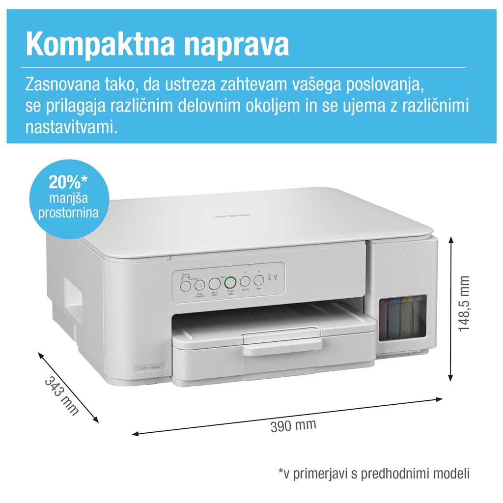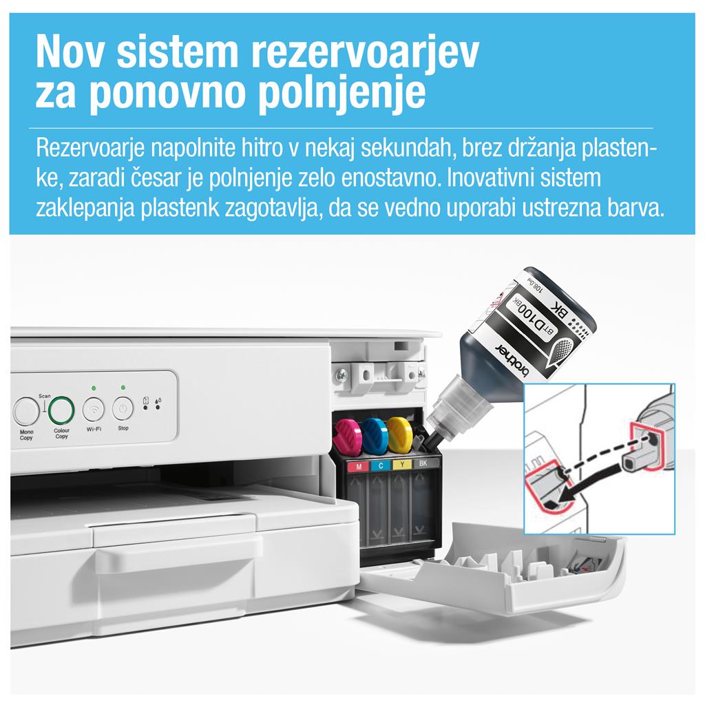 Z rezervoarji za ponovno polnjenje in priloženimi plastenkami črnila velike kapacitete lahko tiskate več in hkrati prihranite pri stroških tiskanja. Enostavno povezovanje in nastavitev omogočata uporabniku prijazno uporabo teh kompaktnih naprav.