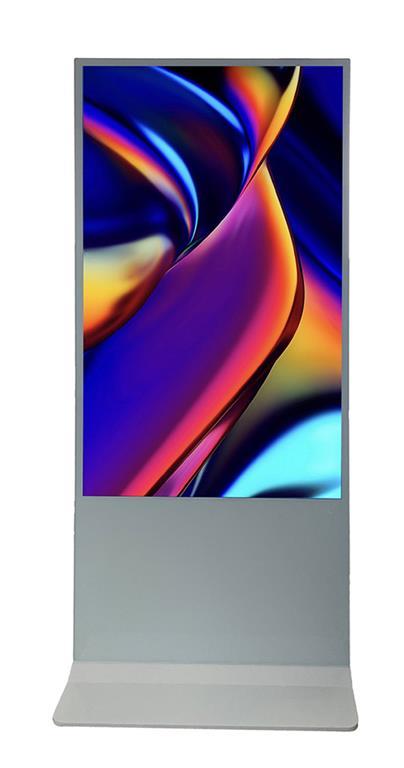 Samostoječ eleganten oglaševalski zaslon izjemno tankega dizajna. Izdelan iz jekla in varnostnega kaljenega stekla. Dostop do omarice z elektroniko zadaj.